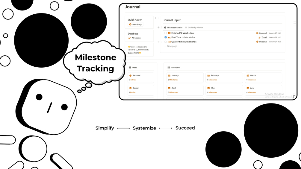 Minimalist and functional journaling template that tracks your milestones across the year so you can reflect on your activities. Main functions include: