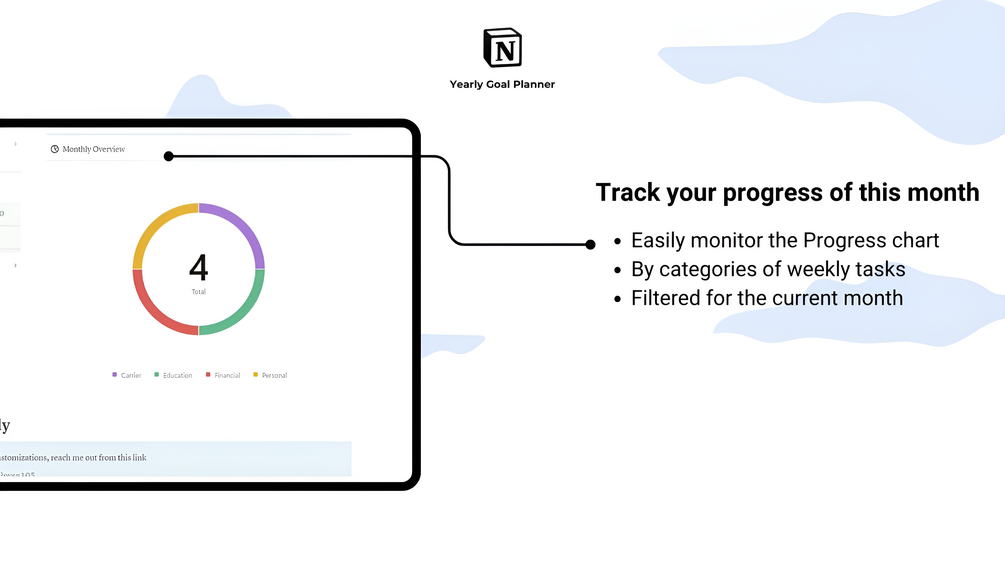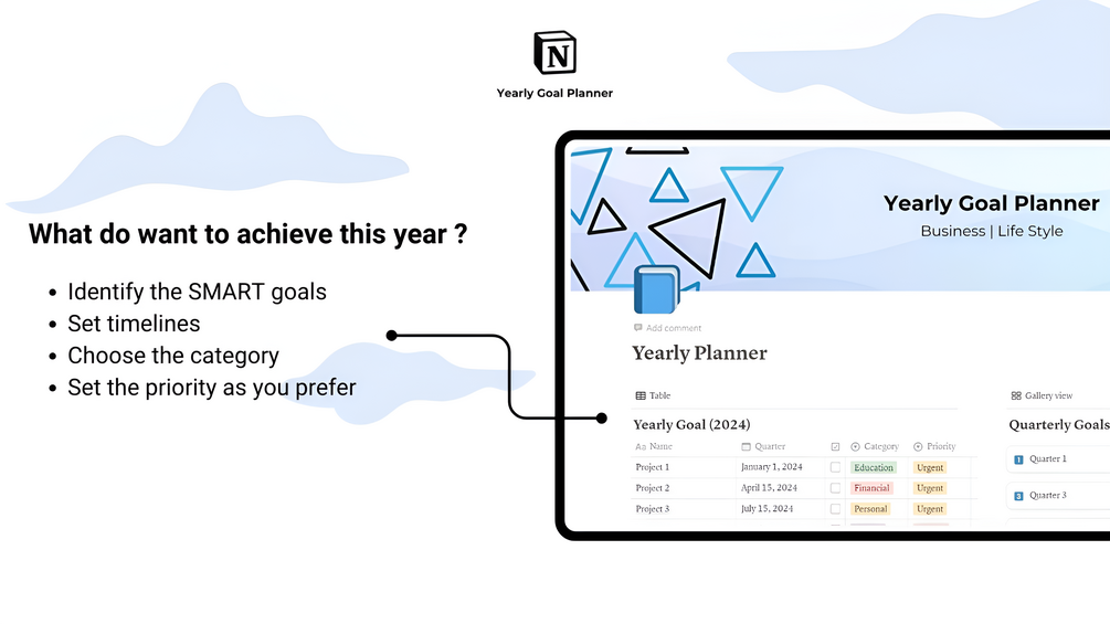 • Set and track yearly goals with clear priorities and deadlines.